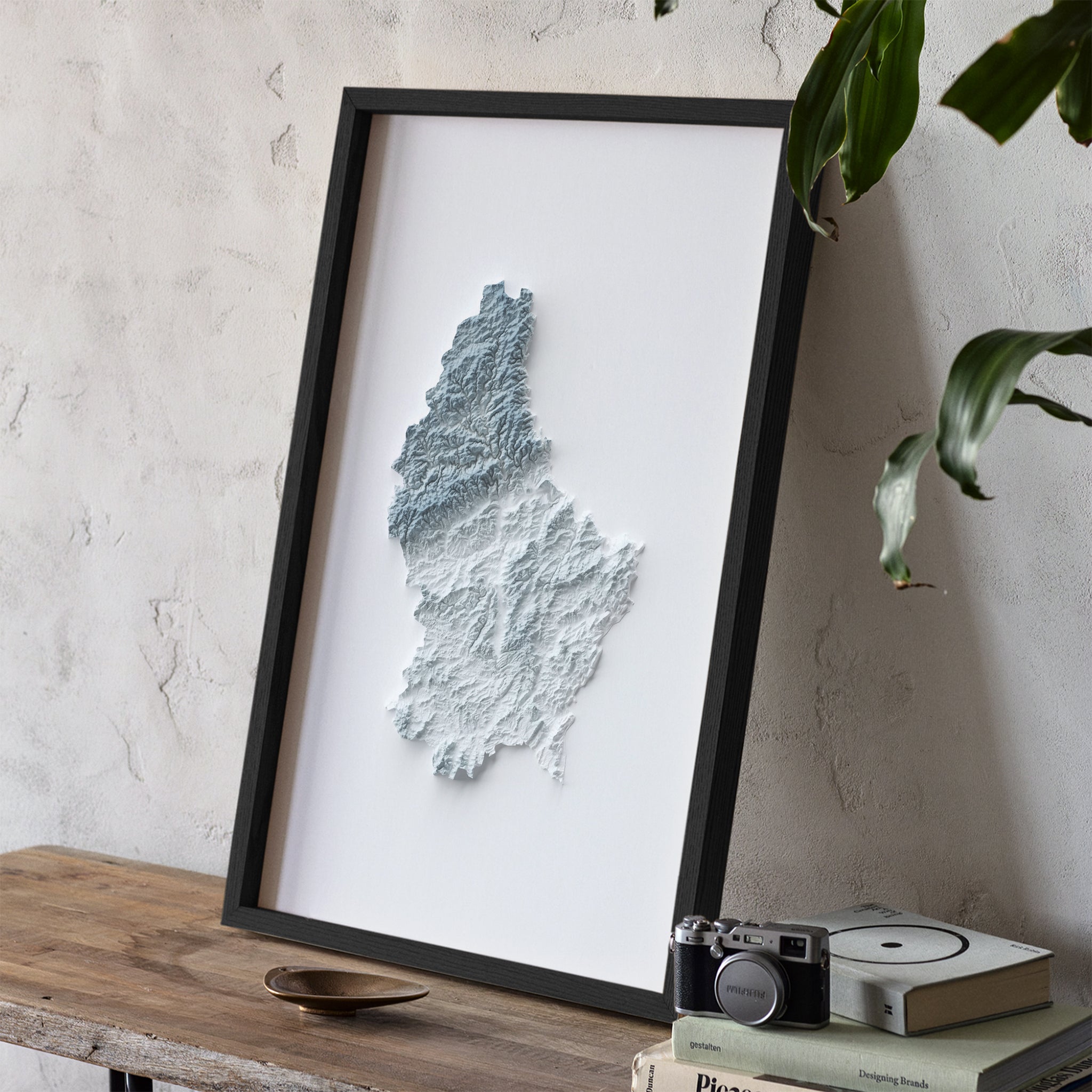 Our minimalist elevation map posters are original designs created using real satellite topographic data and advanced 3D rendering techniques. Each map features exaggerated terrain and dramatic shading to highlight the natural contours of the landscape, producing a striking optical illusion that appears three-dimensional. Printed as high-quality giclée art prints, these modern relief maps bring a clean, bold aesthetic to any space. Perfect for framing and they make for distinctive wall art for a refined addition to your home decor.
