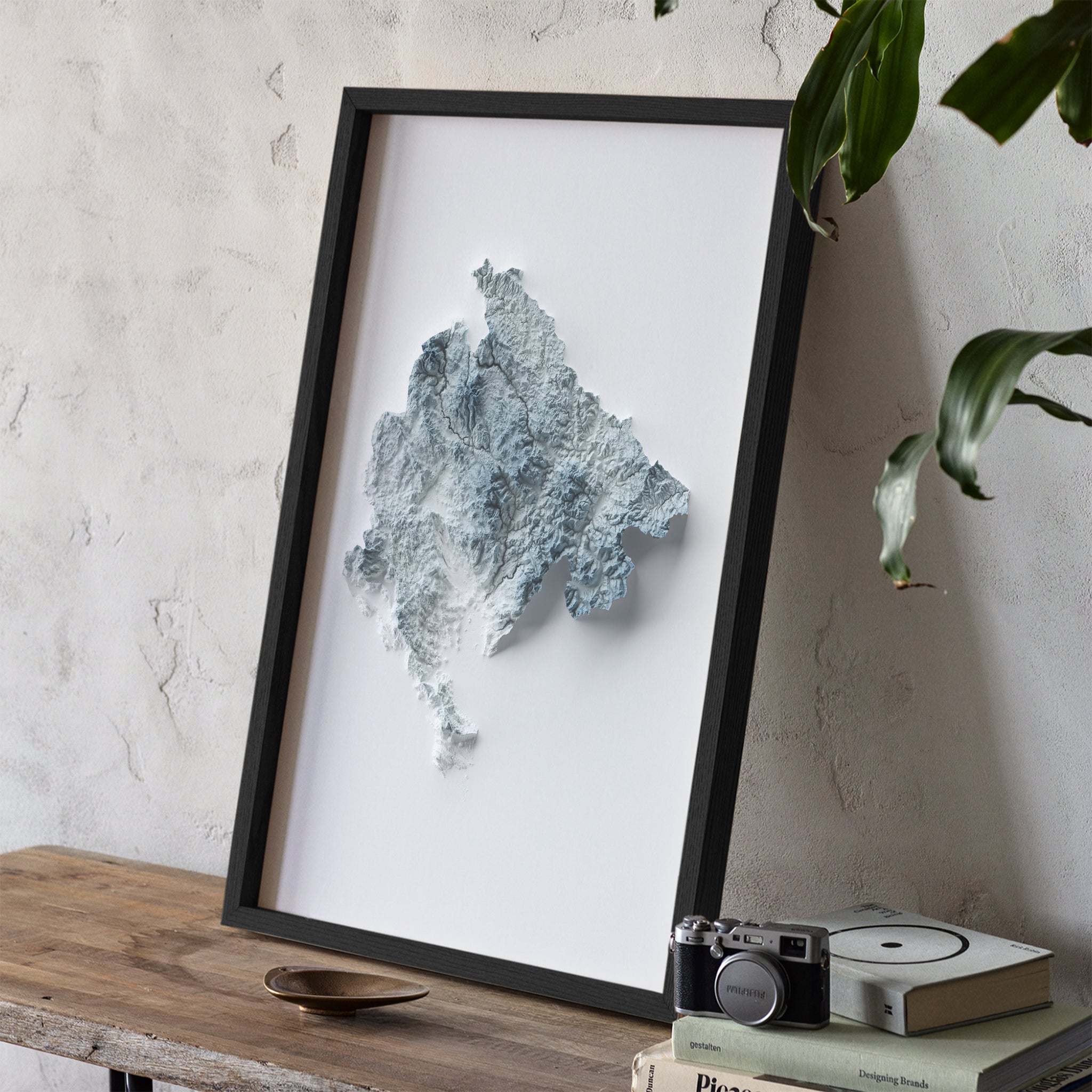Our minimalist elevation map posters are original designs created using real satellite topographic data and advanced 3D rendering techniques. Each map features exaggerated terrain and dramatic shading to highlight the natural contours of the landscape, producing a striking optical illusion that appears three-dimensional. Printed as high-quality giclée art prints, these modern relief maps bring a clean, bold aesthetic to any space. Perfect for framing and they make for distinctive wall art for a refined addition to your home decor.
