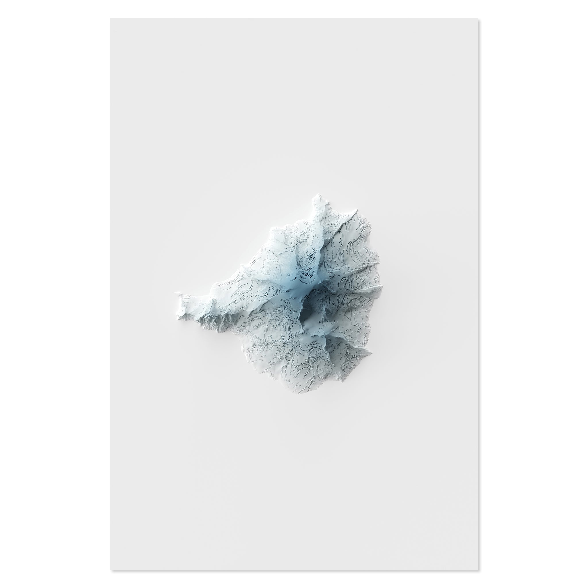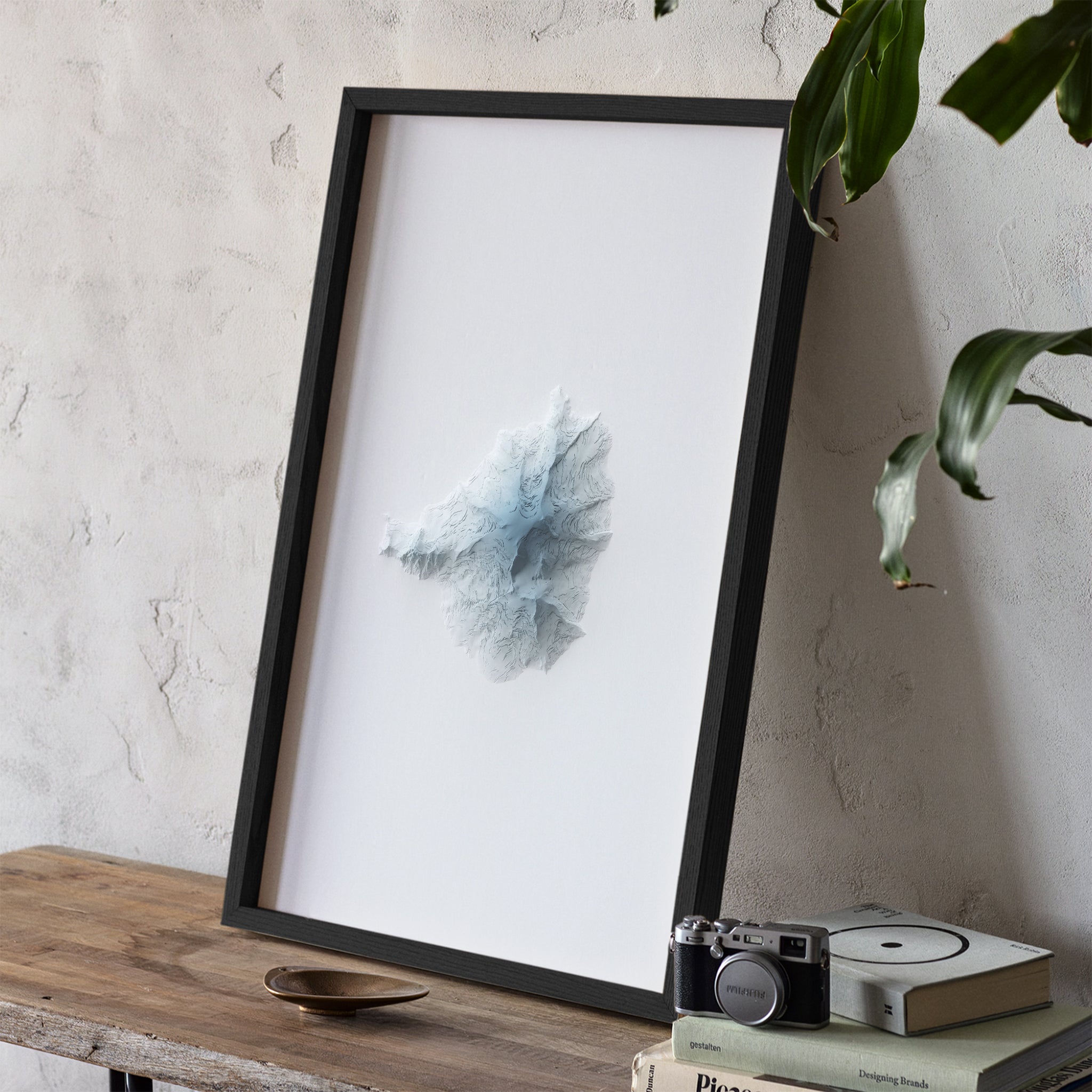 Our minimalist elevation map posters are original designs created using real satellite topographic data and advanced 3D rendering techniques. Each map features exaggerated terrain and dramatic shading to highlight the natural contours of the landscape, producing a striking optical illusion that appears three-dimensional. Printed as high-quality giclée art prints, these modern relief maps bring a clean, bold aesthetic to any space. Perfect for framing and they make for distinctive wall art for a refined addition to your home decor.
