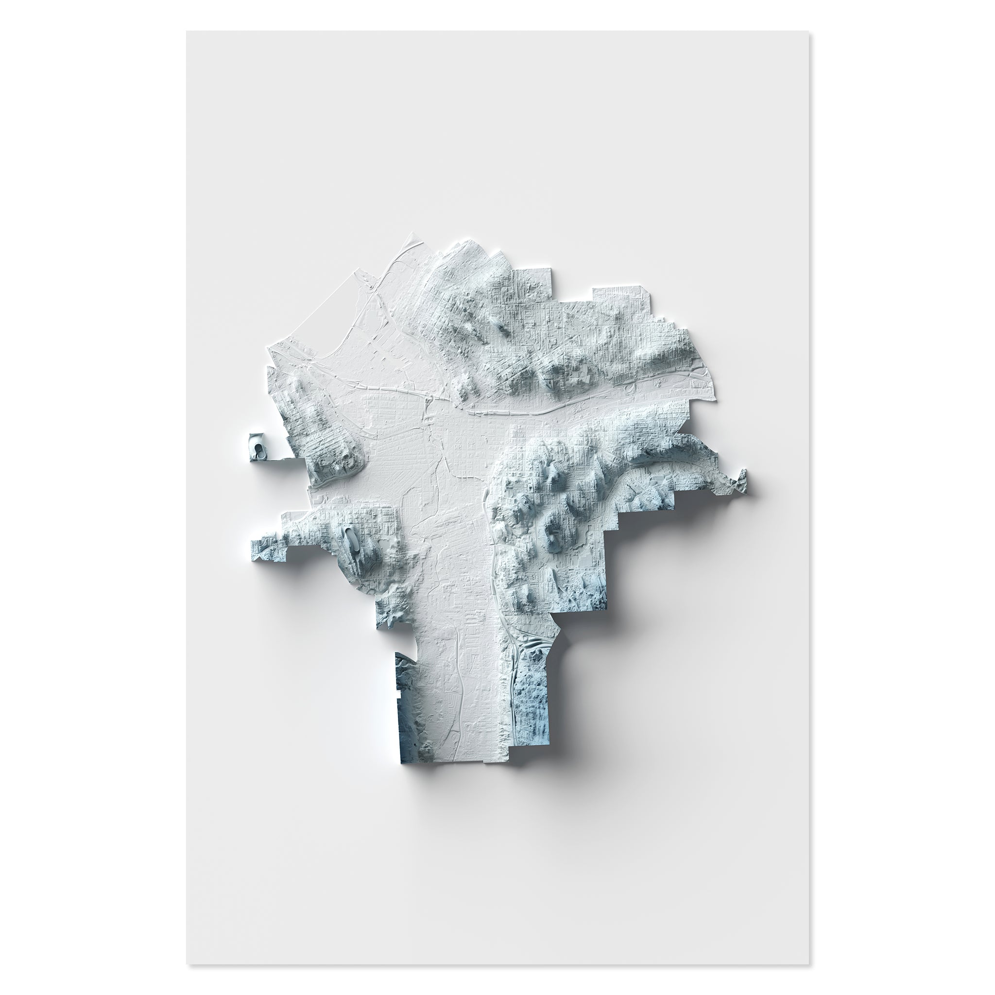 Our minimalist elevation map posters are original designs created using real satellite topographic data and advanced 3D rendering techniques. Each map features exaggerated terrain and dramatic shading to highlight the natural contours of the landscape, producing a striking optical illusion that appears three-dimensional. Printed as high-quality giclée art prints, these modern relief maps bring a clean, bold aesthetic to any space. Perfect for framing and they make for distinctive wall art for a refined addition to your home decor.