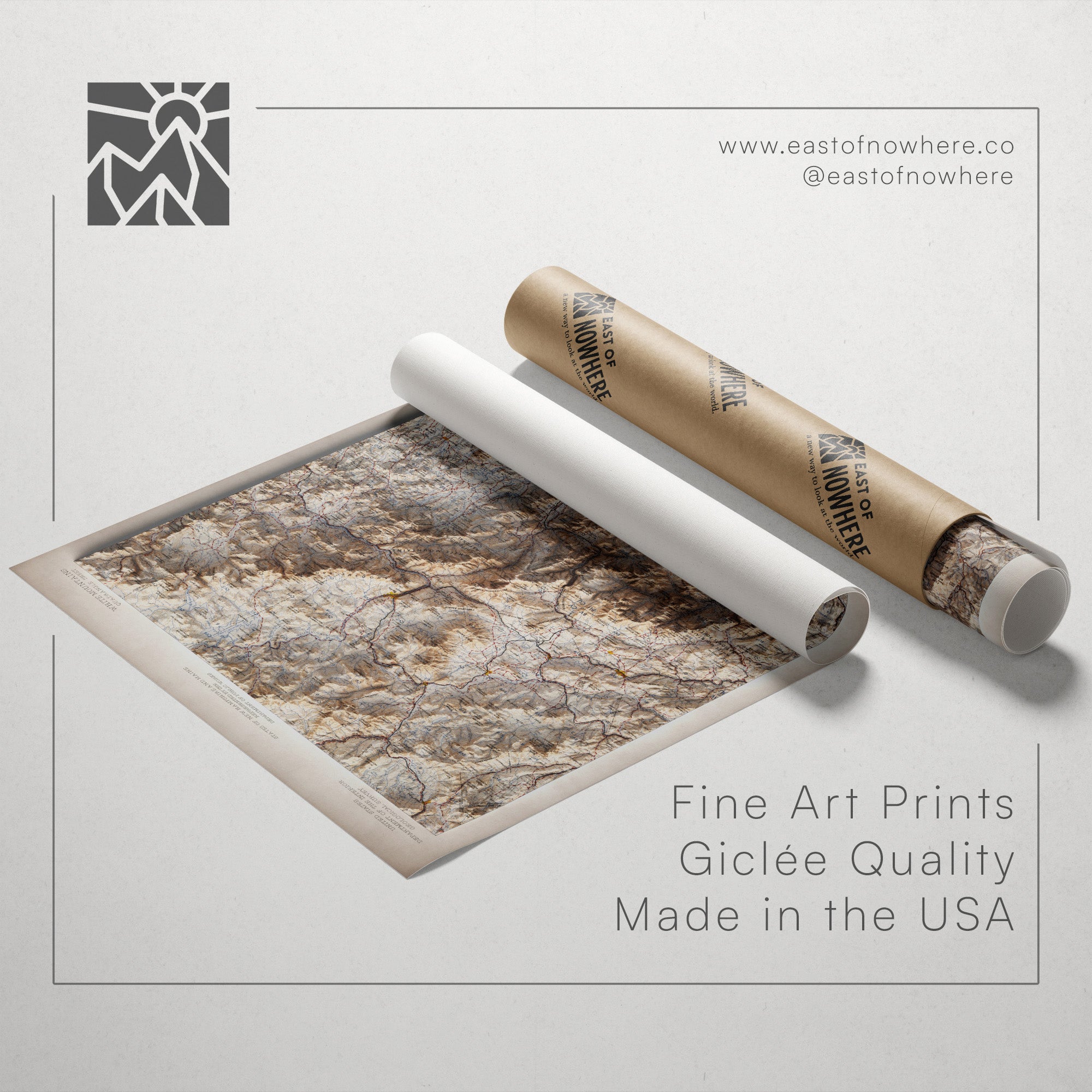 Discover our vintage elevation map posters, authentic reproduction of historic map prints enhanced with modern techniques like colorization and 3D rendering. These giclee art prints feature a stunning optical illusion that mimics raised terrain, creating the look of real topography on your wall. Printed on archival-quality paper, each relief map blends classic cartography with contemporary design, making it perfect for framing as wall art or adding a distinctive touch to your home decor.