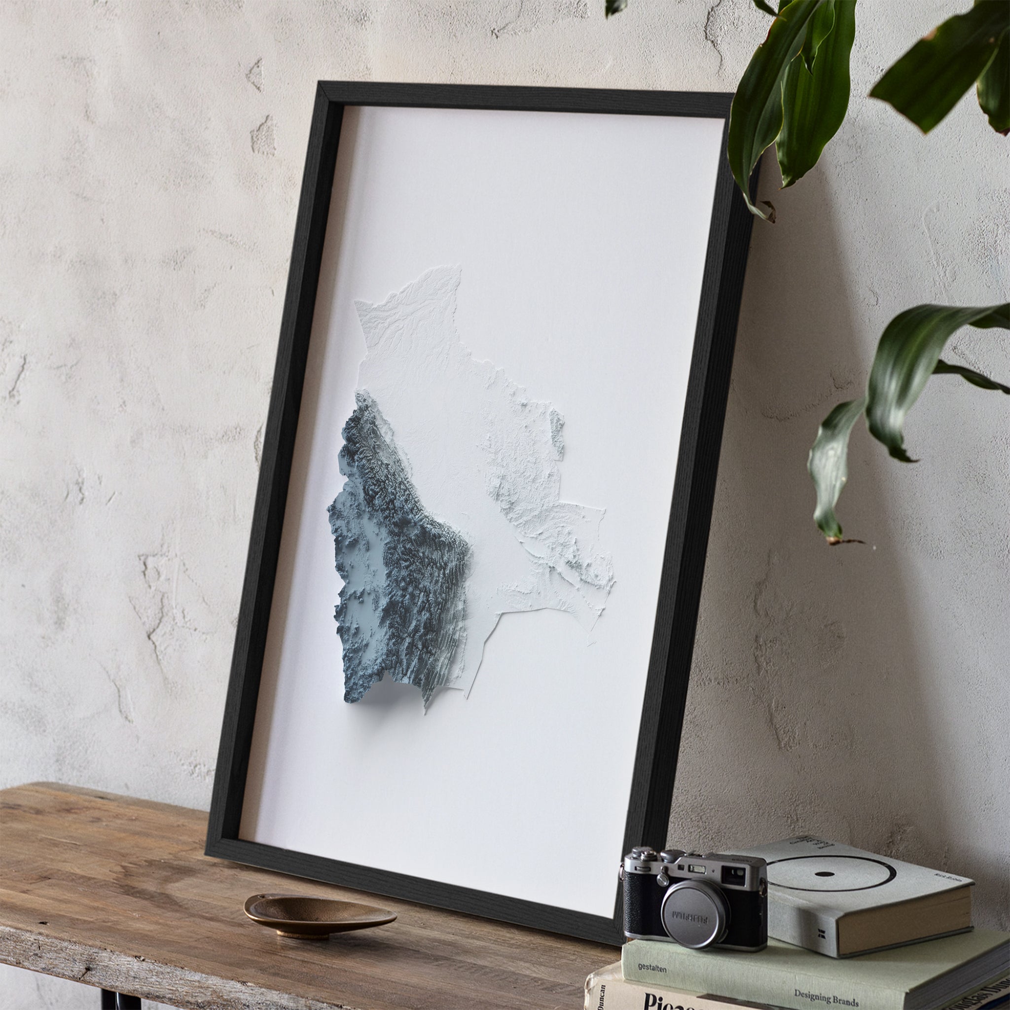 Our minimalist elevation map posters are original designs created using real satellite topographic data and advanced 3D rendering techniques. Each map features exaggerated terrain and dramatic shading to highlight the natural contours of the landscape, producing a striking optical illusion that appears three-dimensional. Printed as high-quality giclée art prints, these modern relief maps bring a clean, bold aesthetic to any space. Perfect for framing and they make for distinctive wall art for a refined addition to your home decor.