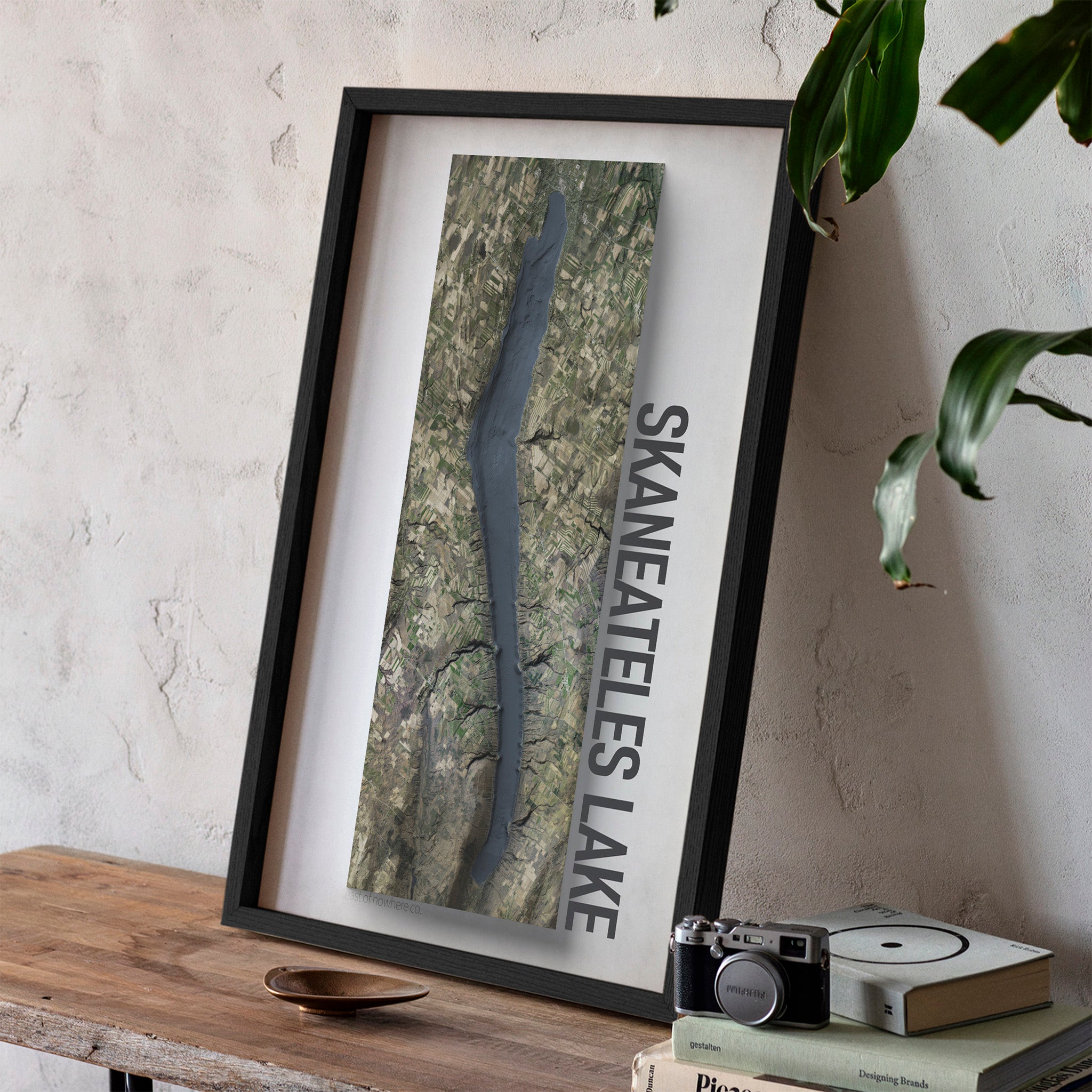 This fine art map transforms newly collected bathymetric data into a stunning 3D rendering of Skaneateles Lake’s hidden underwater landscape. Each print blends scientific precision with East of Nowhere’s signature topographic artistry, revealing every ridge and basin in vivid detail. A portion of proceeds supports ongoing research and efforts to combat harmful algal blooms in the Finger Lakes.