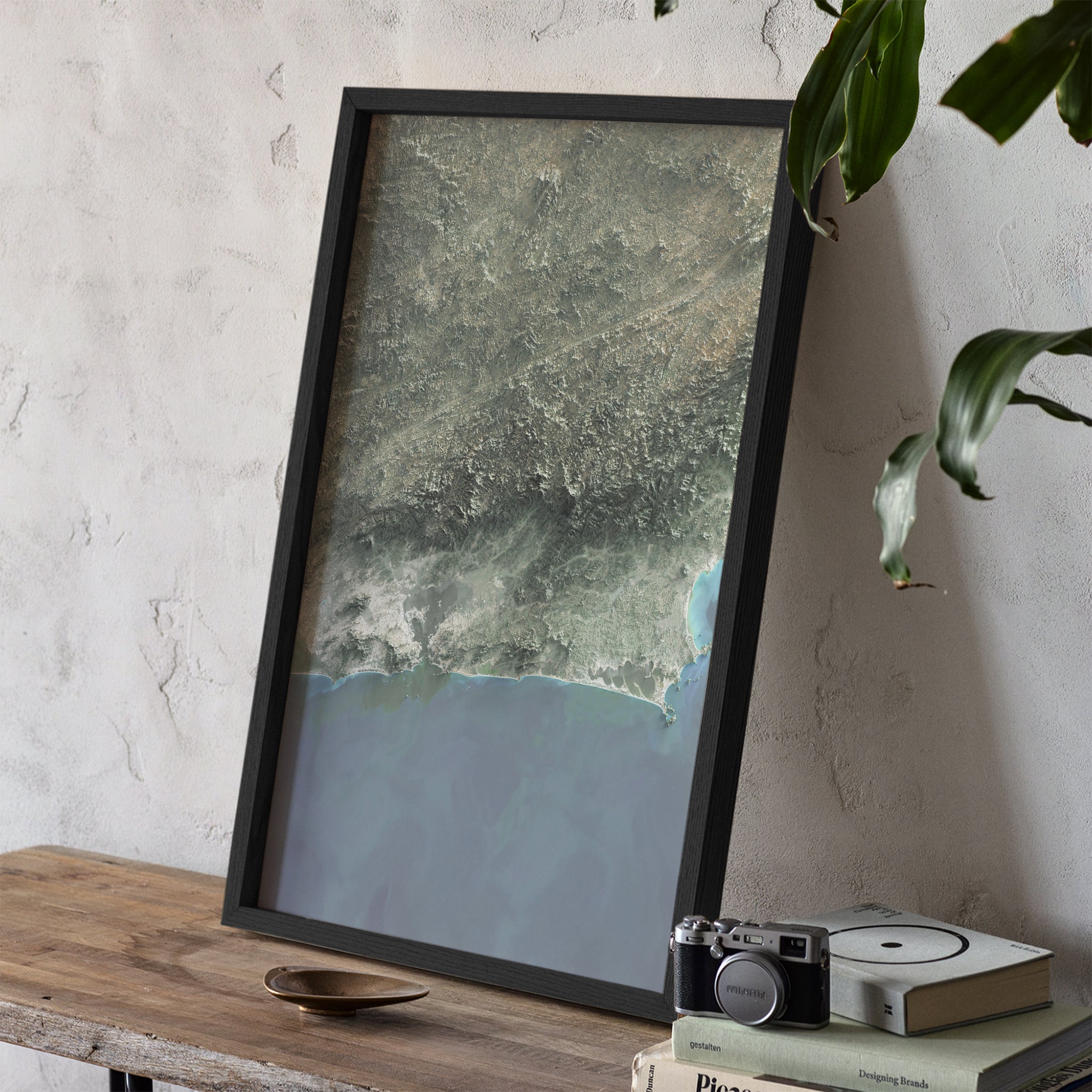Our satellite-style elevation map posters feature a clean, text-free design that highlights the raw beauty of the landscape. Created using real satellite imagery and topographic data, each map is enhanced with 3D rendering to produce a dramatic shaded relief effect and a striking optical illusion of raised terrain. These original designs are printed as high-resolution giclee art prints on archival-quality paper, offering a bold, modern take on wall art. Perfect for framing, they bring natural elegance and a sense of place to any home decor.