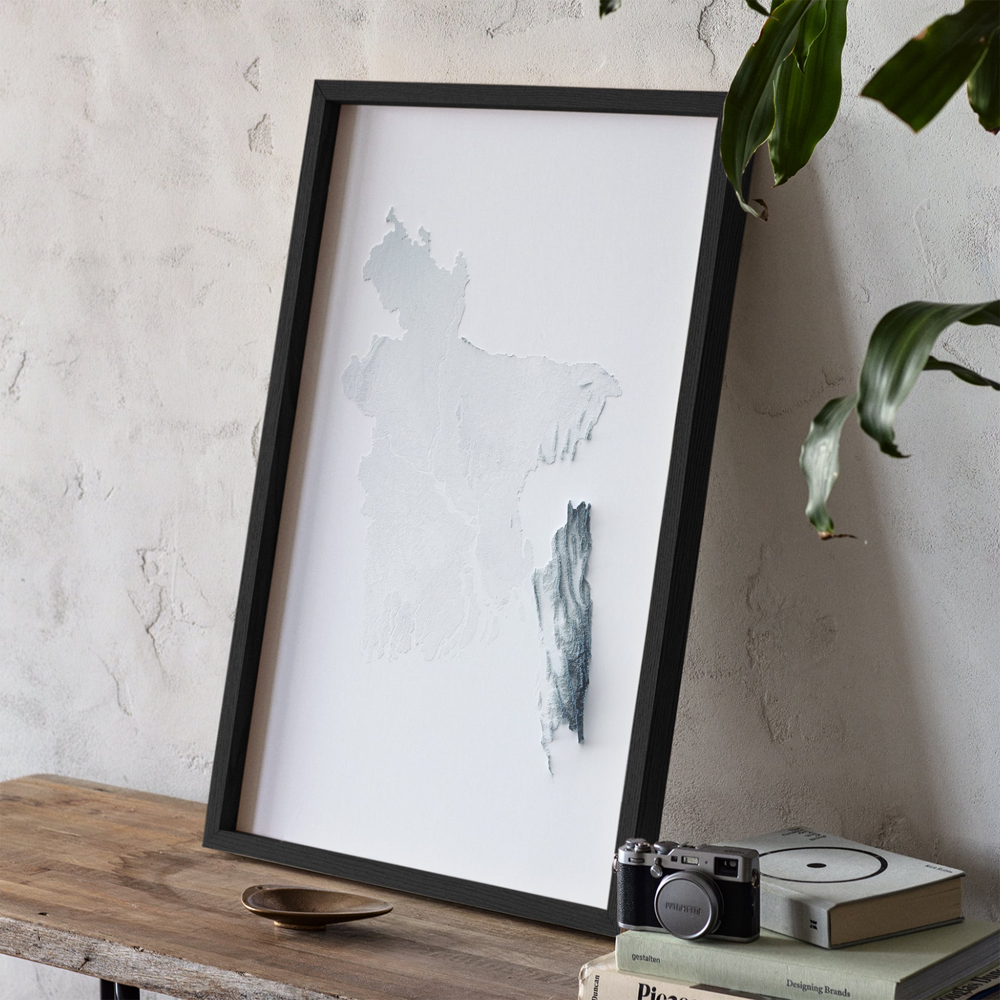 Our minimalist elevation map posters are original designs created using real satellite topographic data and advanced 3D rendering techniques. Each map features exaggerated terrain and dramatic shading to highlight the natural contours of the landscape, producing a striking optical illusion that appears three-dimensional. Printed as high-quality giclée art prints, these modern relief maps bring a clean, bold aesthetic to any space. Perfect for framing and they make for distinctive wall art for a refined addition to your home decor.