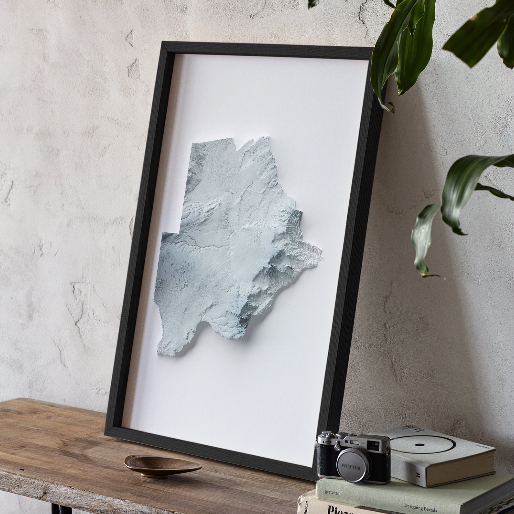 Our minimalist elevation map posters are original designs created using real satellite topographic data and advanced 3D rendering techniques. Each map features exaggerated terrain and dramatic shading to highlight the natural contours of the landscape, producing a striking optical illusion that appears three-dimensional. Printed as high-quality giclée art prints, these modern relief maps bring a clean, bold aesthetic to any space. Perfect for framing and they make for distinctive wall art for a refined addition to your home decor.