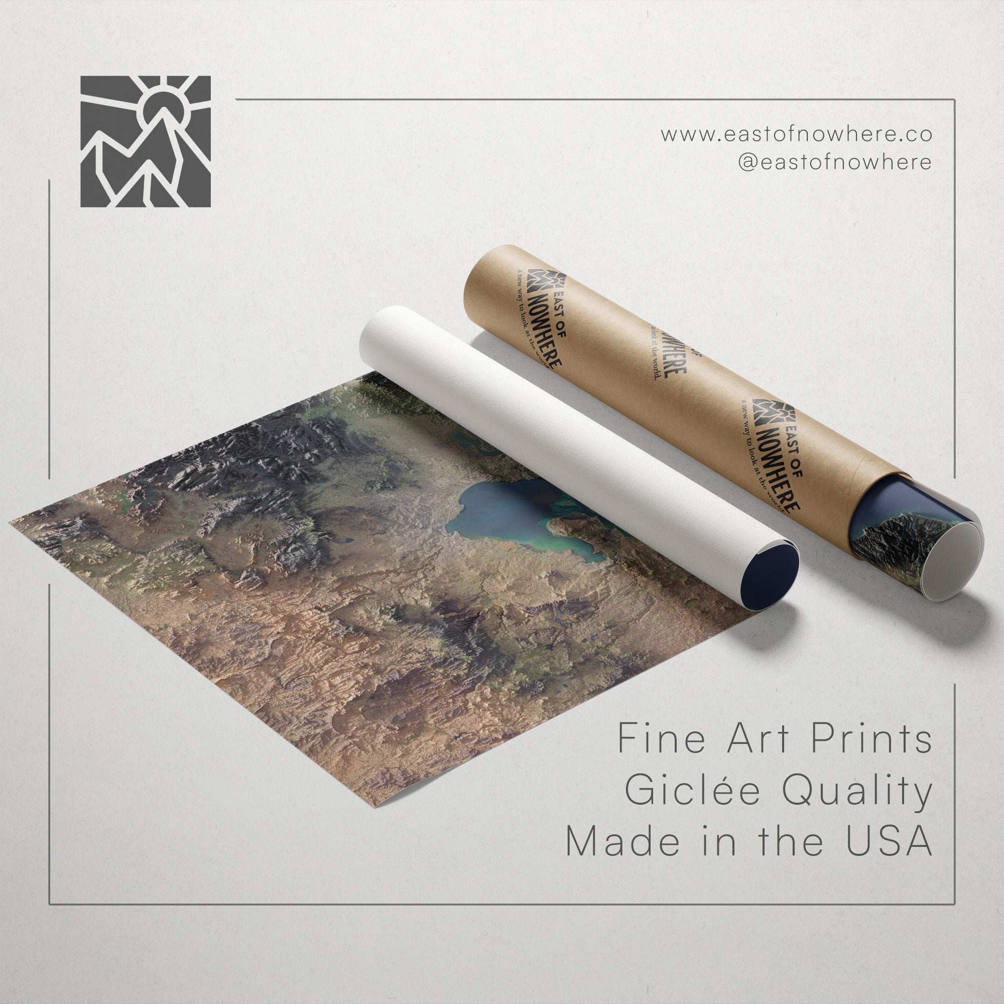 Our satellite-style elevation map posters feature a clean, text-free design that highlights the raw beauty of the landscape. Created using real satellite imagery and topographic data, each map is enhanced with 3D rendering to produce a dramatic shaded relief effect and a striking optical illusion of raised terrain. These original designs are printed as high-resolution giclee art prints on archival-quality paper, offering a bold, modern take on wall art. Perfect for framing, they bring natural elegance and a sense of place to any home decor.