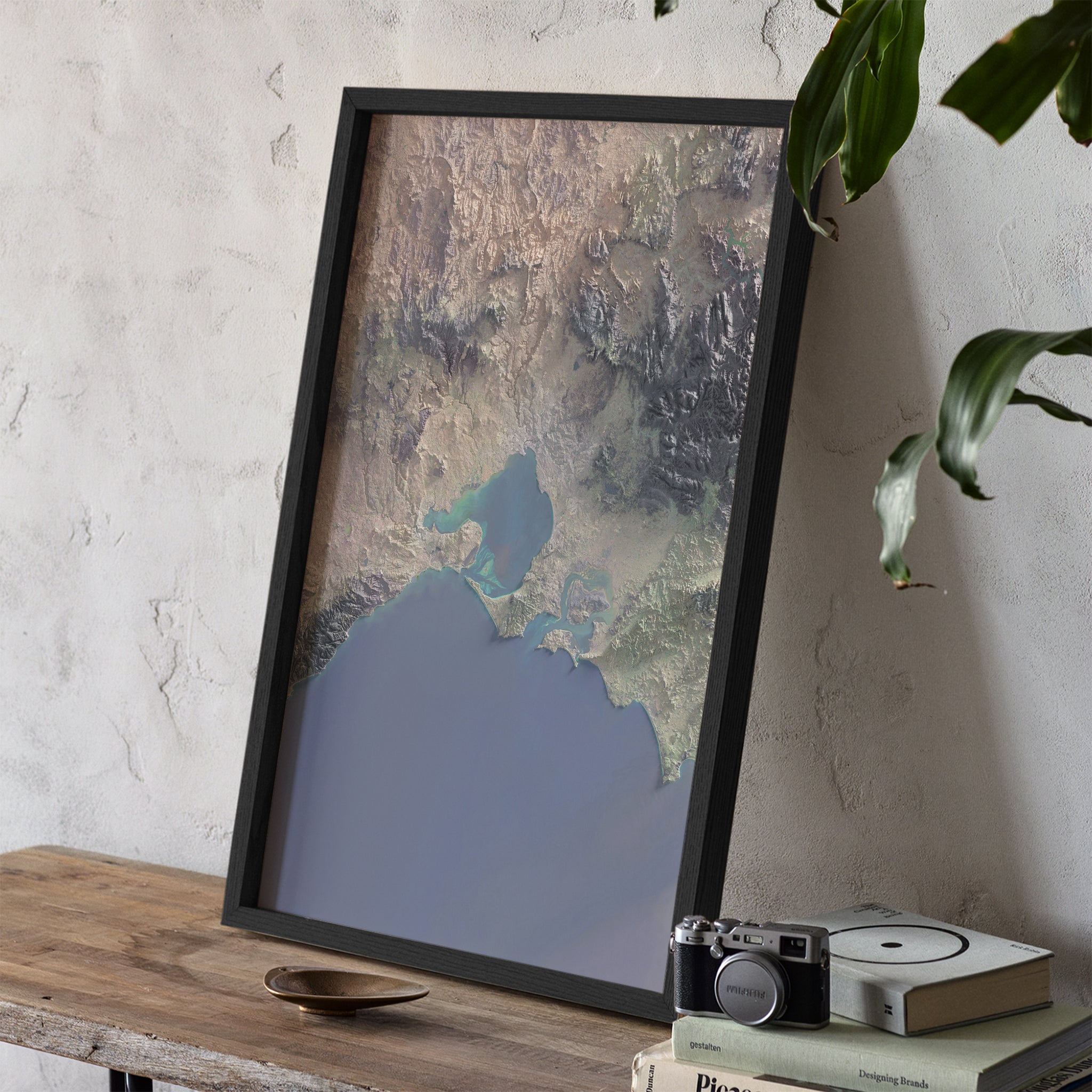 Our satellite-style elevation map posters feature a clean, text-free design that highlights the raw beauty of the landscape. Created using real satellite imagery and topographic data, each map is enhanced with 3D rendering to produce a dramatic shaded relief effect and a striking optical illusion of raised terrain. These original designs are printed as high-resolution giclee art prints on archival-quality paper, offering a bold, modern take on wall art. Perfect for framing, they bring natural elegance and a sense of place to any home decor.