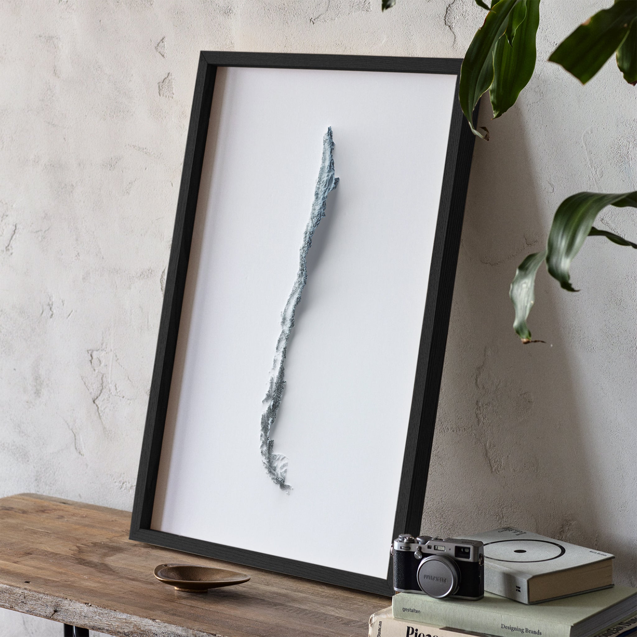 Our minimalist elevation map posters are original designs created using real satellite topographic data and advanced 3D rendering techniques. Each map features exaggerated terrain and dramatic shading to highlight the natural contours of the landscape, producing a striking optical illusion that appears three-dimensional. Printed as high-quality giclée art prints, these modern relief maps bring a clean, bold aesthetic to any space. Perfect for framing and they make for distinctive wall art for a refined addition to your home decor.