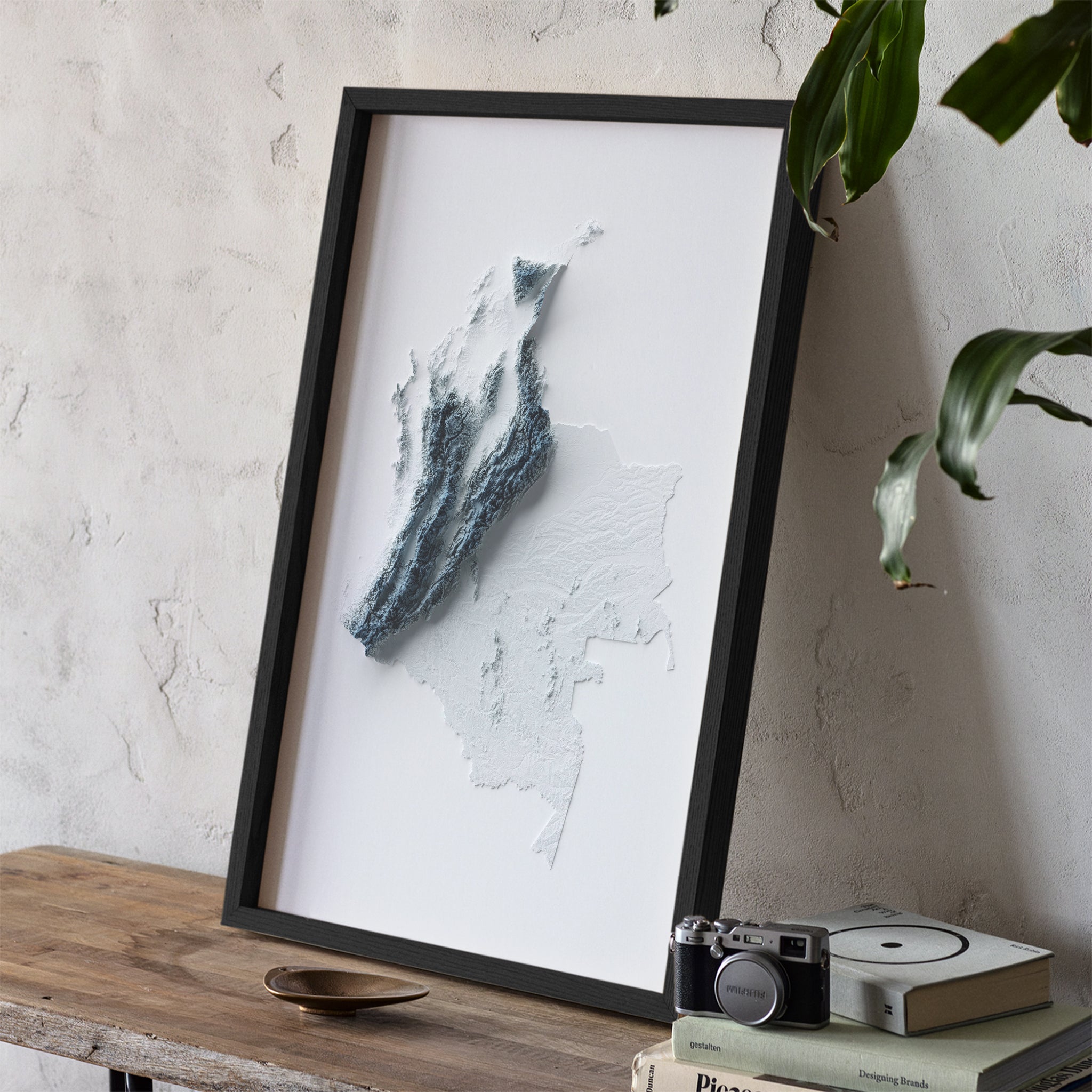Our minimalist elevation map posters are original designs created using real satellite topographic data and advanced 3D rendering techniques. Each map features exaggerated terrain and dramatic shading to highlight the natural contours of the landscape, producing a striking optical illusion that appears three-dimensional. Printed as high-quality giclée art prints, these modern relief maps bring a clean, bold aesthetic to any space. Perfect for framing and they make for distinctive wall art for a refined addition to your home decor.