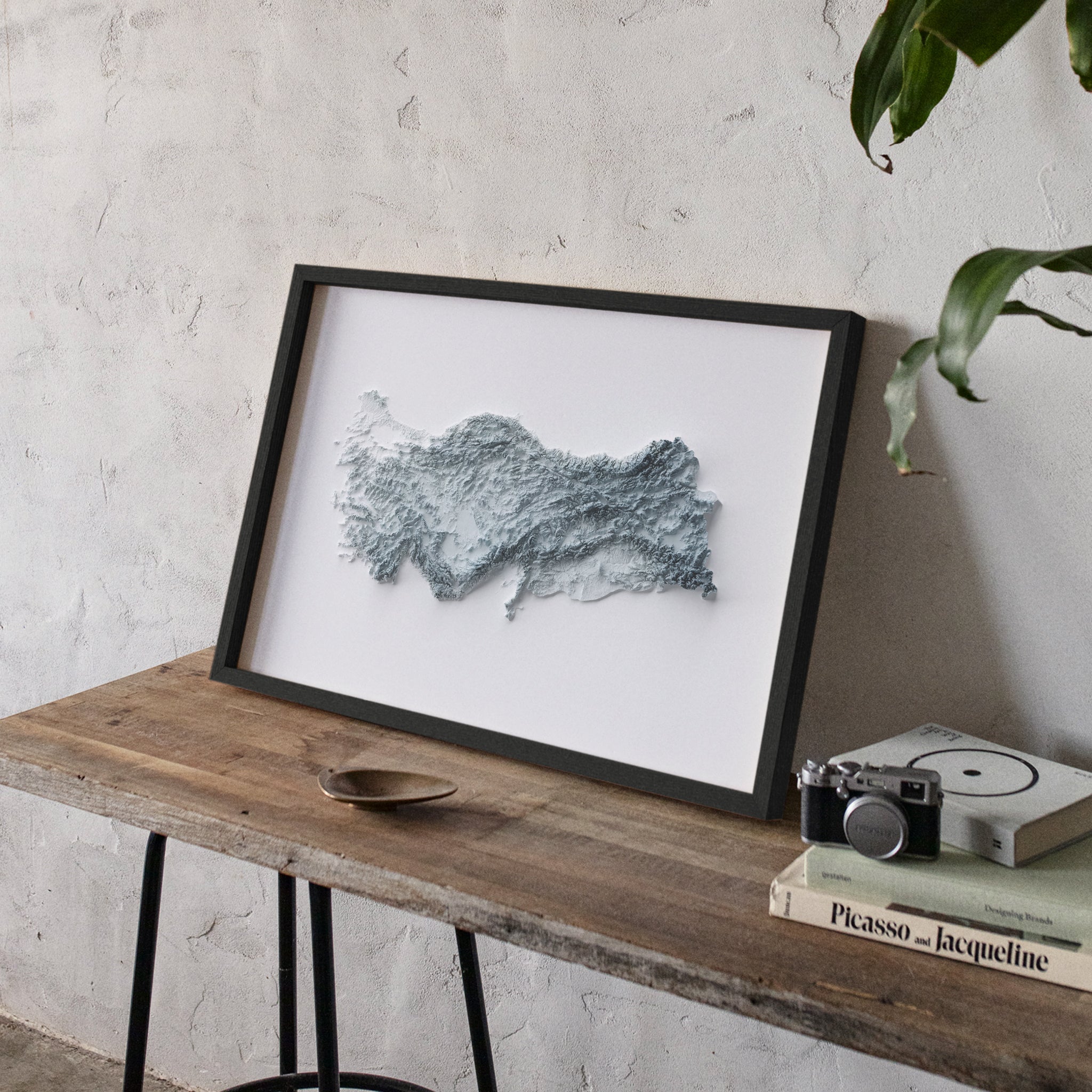 Our minimalist elevation map posters are original designs created using real satellite topographic data and advanced 3D rendering techniques. Each map features exaggerated terrain and dramatic shading to highlight the natural contours of the landscape, producing a striking optical illusion that appears three-dimensional. Printed as high-quality giclée art prints, these modern relief maps bring a clean, bold aesthetic to any space. Perfect for framing and they make for distinctive wall art for a refined addition to your home decor.