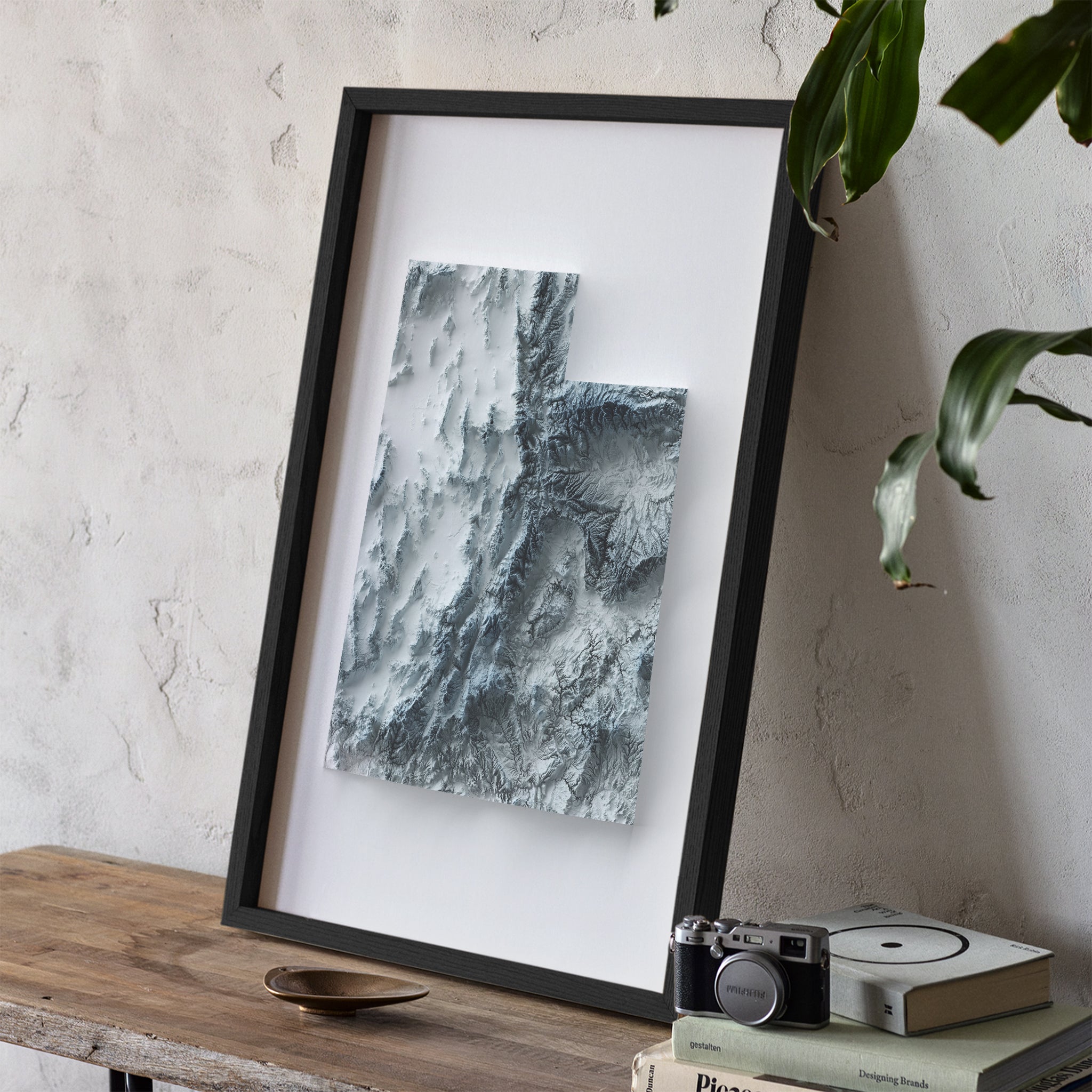 Our minimalist elevation map posters are original designs created using real satellite topographic data and advanced 3D rendering techniques. Each map features exaggerated terrain and dramatic shading to highlight the natural contours of the landscape, producing a striking optical illusion that appears three-dimensional. Printed as high-quality giclée art prints, these modern relief maps bring a clean, bold aesthetic to any space. Perfect for framing and they make for distinctive wall art for a refined addition to your home decor.