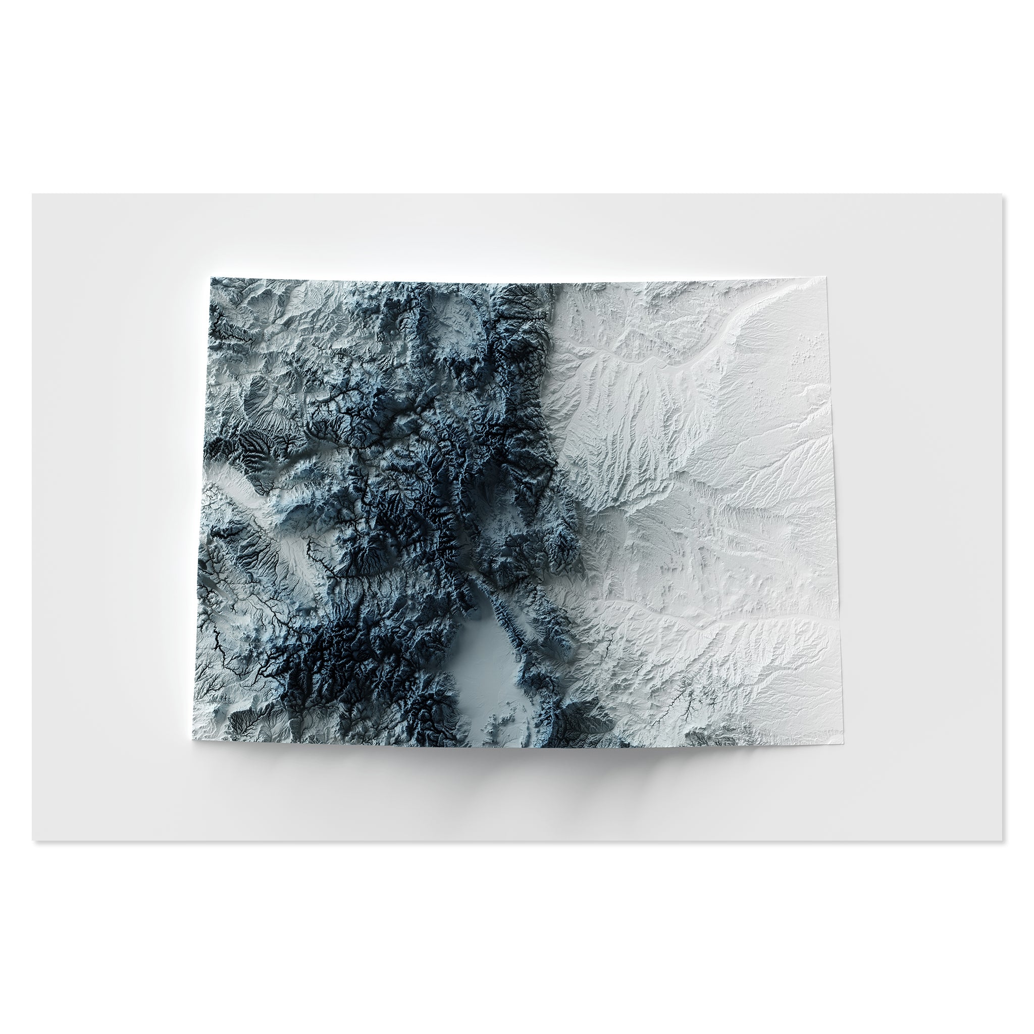 Our minimalist elevation map posters are original designs created using real satellite topographic data and advanced 3D rendering techniques. Each map features exaggerated terrain and dramatic shading to highlight the natural contours of the landscape, producing a striking optical illusion that appears three-dimensional. Printed as high-quality giclée art prints, these modern relief maps bring a clean, bold aesthetic to any space. Perfect for framing and they make for distinctive wall art for a refined addition to your home decor.