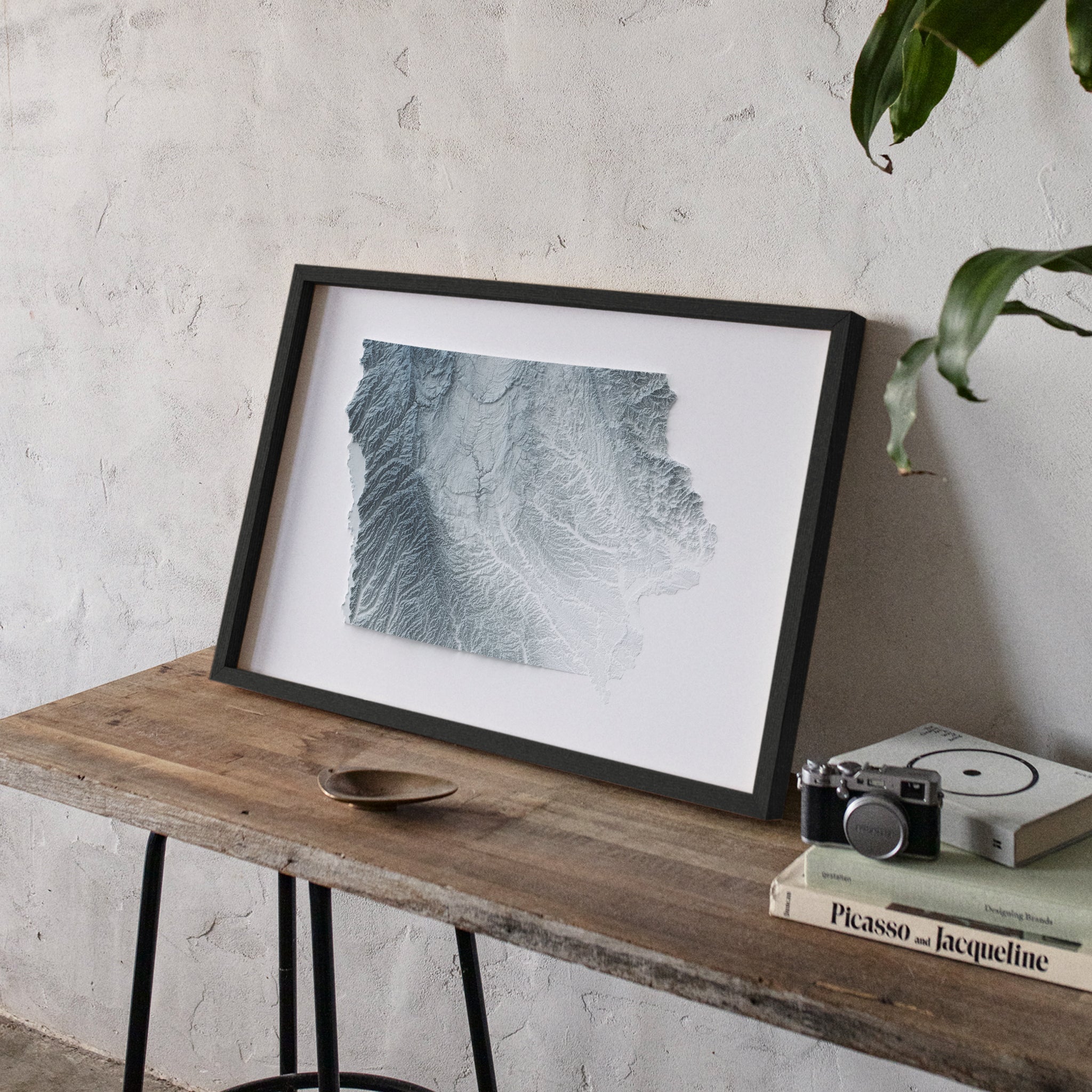 Our minimalist elevation map posters are original designs created using real satellite topographic data and advanced 3D rendering techniques. Each map features exaggerated terrain and dramatic shading to highlight the natural contours of the landscape, producing a striking optical illusion that appears three-dimensional. Printed as high-quality giclée art prints, these modern relief maps bring a clean, bold aesthetic to any space. Perfect for framing and they make for distinctive wall art for a refined addition to your home decor.