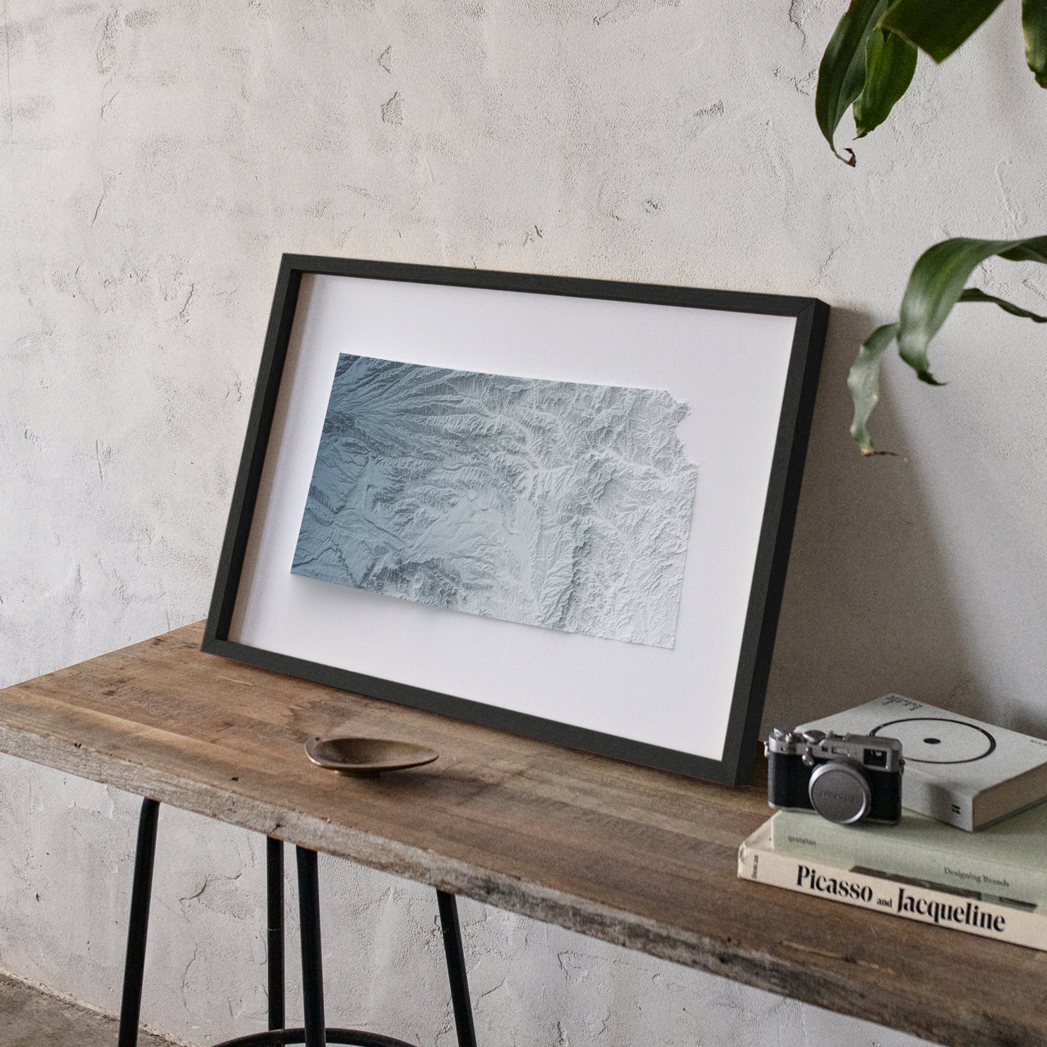 Our minimalist elevation map posters are original designs created using real satellite topographic data and advanced 3D rendering techniques. Each map features exaggerated terrain and dramatic shading to highlight the natural contours of the landscape, producing a striking optical illusion that appears three-dimensional. Printed as high-quality giclée art prints, these modern relief maps bring a clean, bold aesthetic to any space. Perfect for framing and they make for distinctive wall art for a refined addition to your home decor.