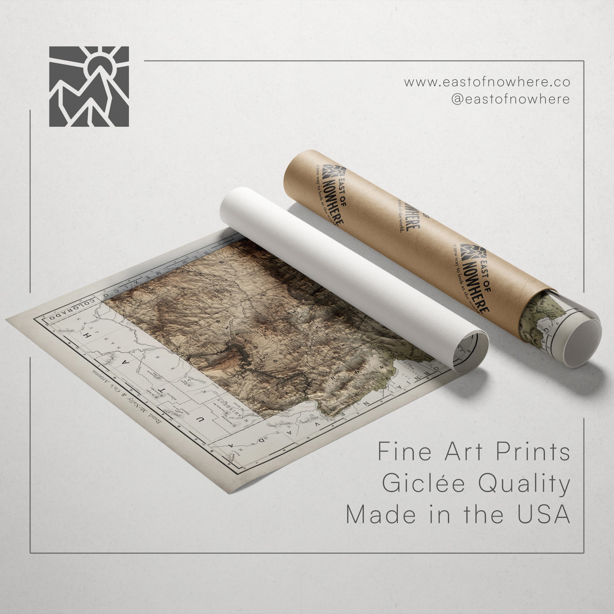 Discover our vintage elevation map posters, authentic reproduction of historic map prints enhanced with modern techniques like colorization and 3D rendering. These giclee art prints feature a stunning optical illusion that mimics raised terrain, creating the look of real topography on your wall. Printed on archival-quality paper, each relief map blends classic cartography with contemporary design, making it perfect for framing as wall art or adding a distinctive touch to your home decor.
