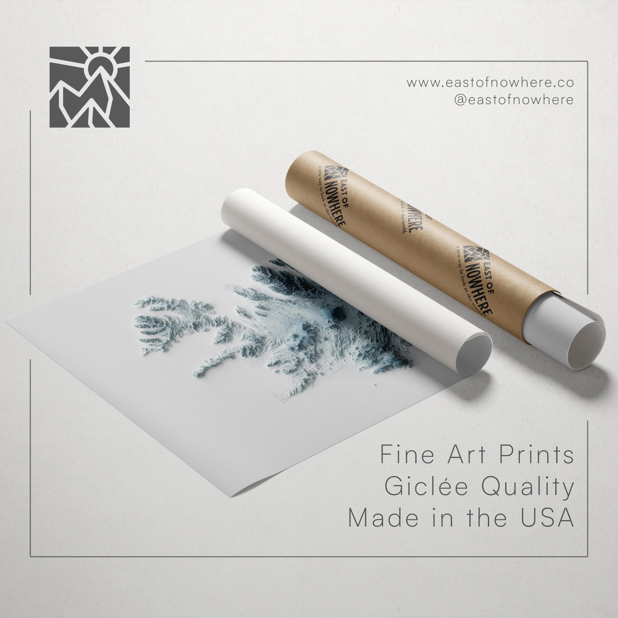 Our minimalist elevation map posters are original designs created using real satellite topographic data and advanced 3D rendering techniques. Each map features exaggerated terrain and dramatic shading to highlight the natural contours of the landscape, producing a striking optical illusion that appears three-dimensional. Printed as high-quality giclée art prints, these modern relief maps bring a clean, bold aesthetic to any space. Perfect for framing and they make for distinctive wall art for a refined addition to your home decor.