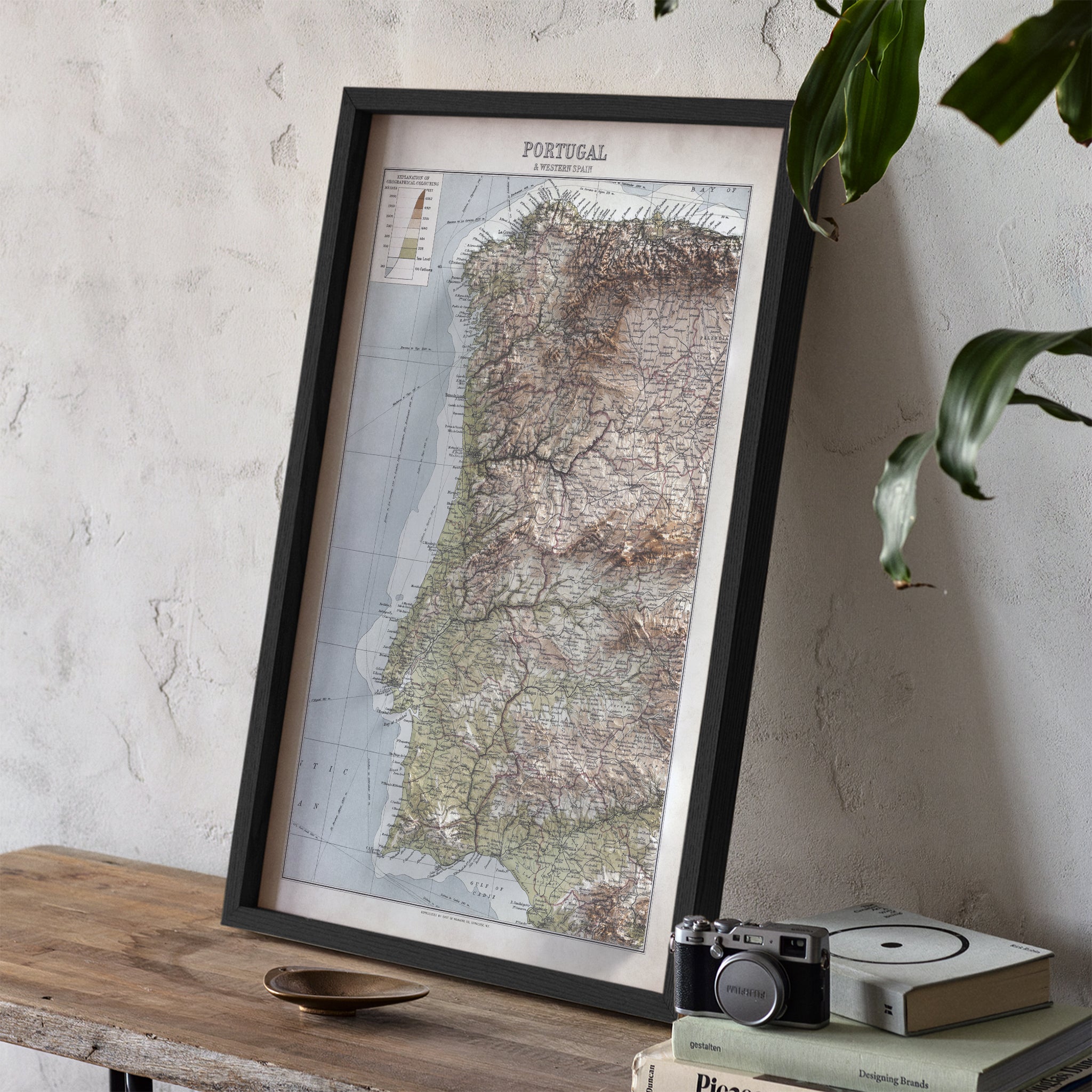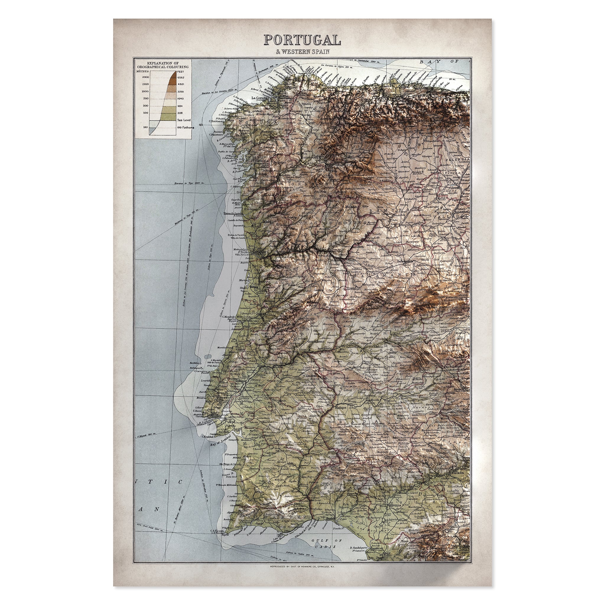 Portugal and Western Spain Elevation Map | 1922 Vintage Topographic Reproduction