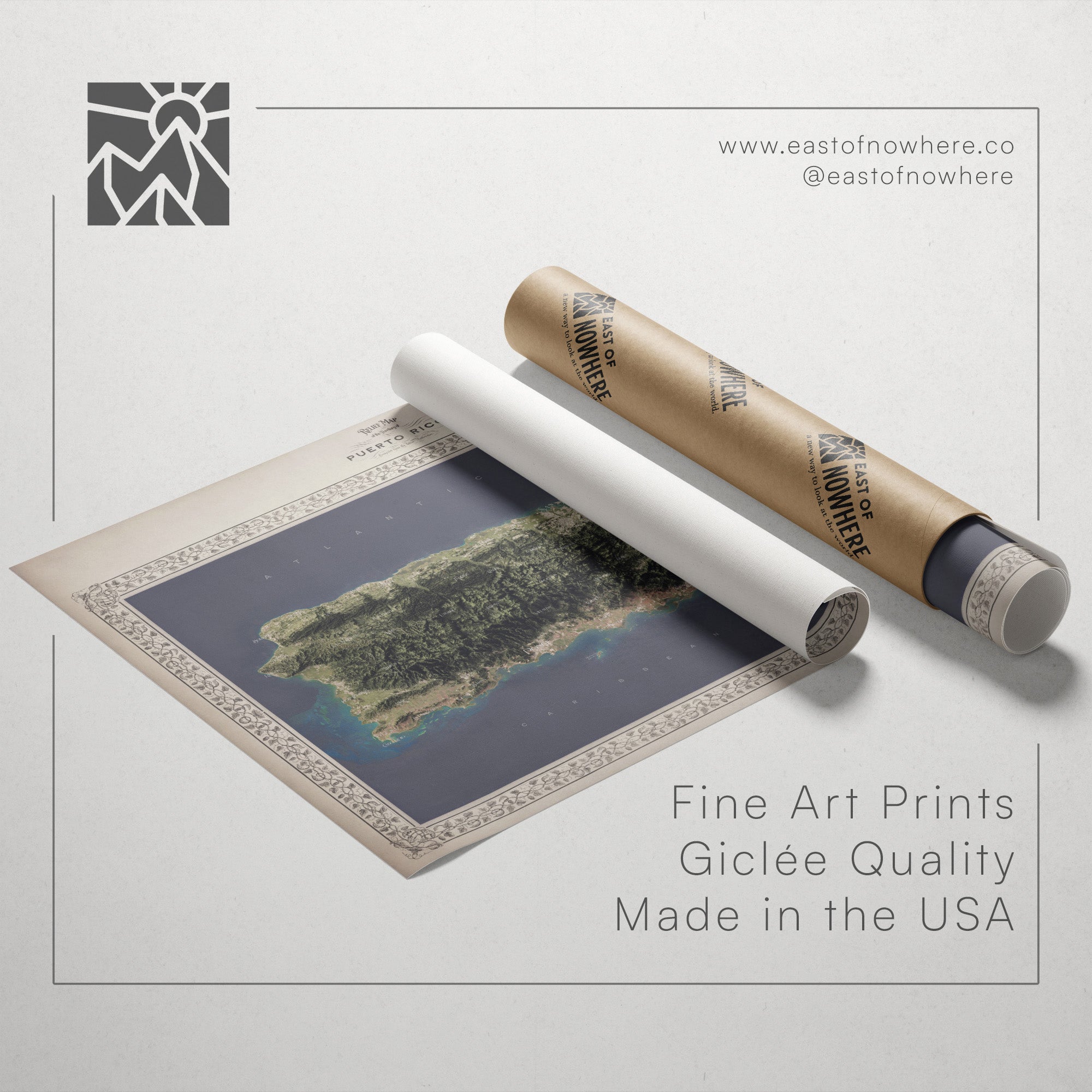Our atlas-style elevation map posters are original designs inspired by the look and feel of antique atlas pages. Combining modern topographic data and labeling with vintage-inspired styling, these maps blend old-world charm with contemporary accuracy. Each piece is rendered using advanced 3D techniques to create a dramatic shaded relief effect, producing a striking optical illusion of raised terrain. Printed as archival-quality giclée art prints, they offer timeless wall art that’s perfect for framing and elevating your home decor with a touch of history.