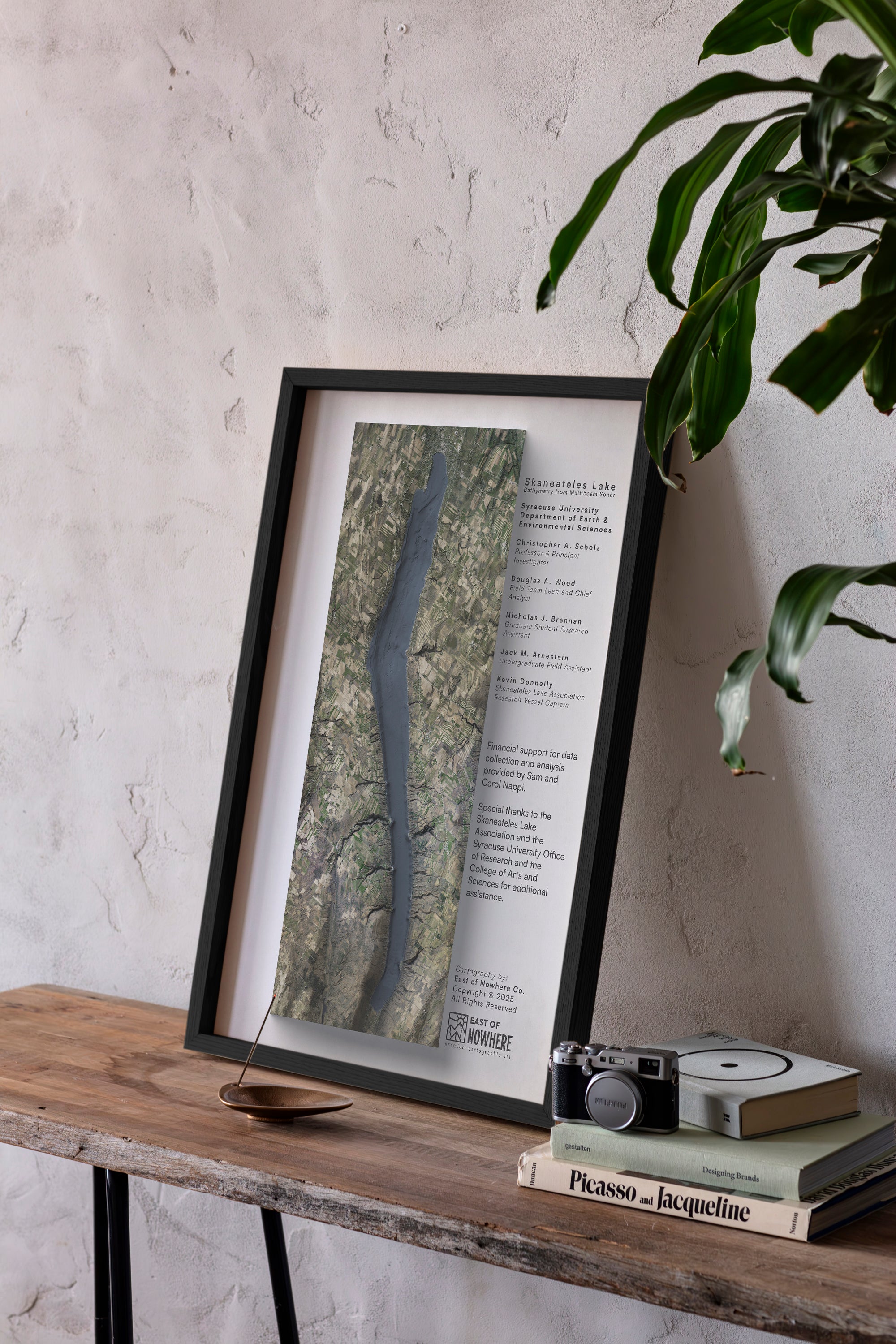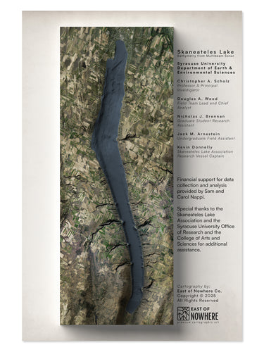 This fine art map transforms newly collected bathymetric data into a stunning 3D rendering of Skaneateles Lake’s hidden underwater landscape. Each print blends scientific precision with East of Nowhere’s signature topographic artistry, revealing every ridge and basin in vivid detail. A portion of proceeds supports ongoing research and efforts to combat harmful algal blooms in the Finger Lakes.